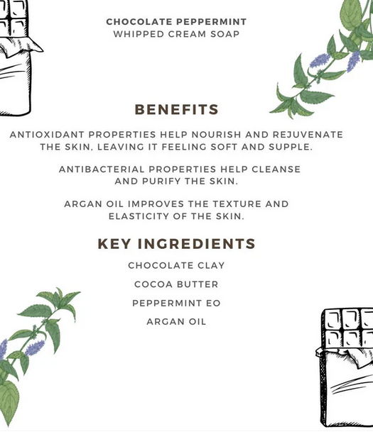 Key Ingredients: Argan Oil, Cocoa Butter, chocolate clay, chocolate FO, peppermint EO, safe colorant & preservatives.